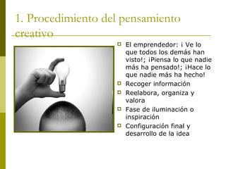 El documento describe los procedimientos del pensamiento creativo para desarrollar una idea emprendedora, incluyendo recopilar información, reelaborarla y tener una inspiración. Explica técnicas como la tormenta de ideas y el pensamiento lateral para generar ideas, así como los pasos para iniciar un proyecto empresarial como describir la idea, analizar a los consumidores y objetivos del negocio.