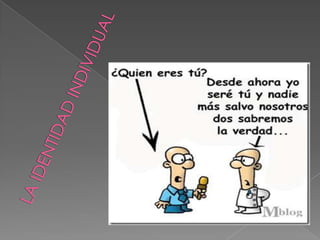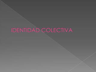 La identidad cultural es el conjunto de valores, tradiciones y símbolos compartidos por los miembros de un grupo social que les dan un sentido de pertenencia. Existen dos perspectivas para estudiar la identidad: la esencialista, que considera que la identidad se hereda culturalmente, y la constructivista, que sostiene que la identidad se construye dinámicamente a través de la interacción social. La identidad colectiva es el estado de conciencia compartido de pertenencia a una categoría o comunidad.