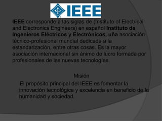 El documento habla sobre el Instituto de Ingenieros Eléctricos y Electrónicos (IEEE), la organización técnica más grande del mundo. Explica la misión, visión e historia del IEEE, así como varios de sus estándares importantes para redes, incluyendo IEEE 802.11 para redes inalámbricas, IEEE 802.16 para redes de banda ancha y otros estándares para redes Ethernet, Token Ring y más.