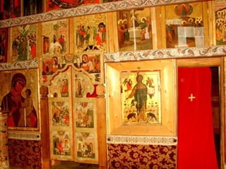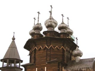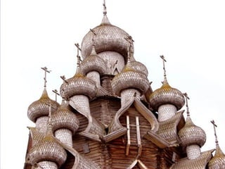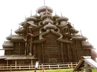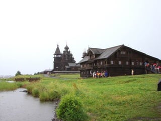 Este documento describe la Iglesia de Kizhi en las orillas del lago Onega en Rusia. Describe el interior de la iglesia menor o de invierno, que muestra una mezcla de iconos religiosos rusos y bordados carelianos finlandeses. También describe la visita a la casa grande y sus tradiciones carelianas, incluyendo bordados hechos durante los largos inviernos, una habitación finlandesa típica, hornos para cocinar y herramientas guardadas en el sótano. Menciona adem