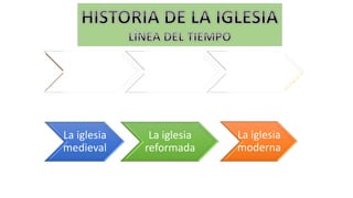 Este documento resume los principales aspectos de la iglesia medieval, incluyendo el progreso del poder papal, el surgimiento del Islam y el poder musulmán, el desarrollo del monacato, las cruzadas, y los eventos que condujeron a la Reforma Protestante como las enseñanzas de Juan Huss y Juan Wycliff. Cubre un periodo desde aproximadamente el siglo VI hasta el siglo XVI.