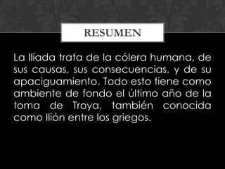 La Ilíada narra la cólera de Aquiles luego de que Agamenón le quitara su botín de guerra, lo que lleva a Aquiles a retirarse de la batalla. La muerte a manos de Héctor de su amigo Patroclo, quien tomó su lugar en la guerra, enfurece a Aquiles y lo impulsa a buscar venganza contra Héctor, a quien mata después de una larga persecución. El poema concluye con el funeral de Héctor luego de que su padre Príamo suplicara a Aquiles por el cuerpo de