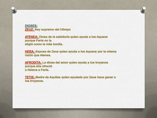 La monografía resume la obra épica La Iliada de Homero. Narra la historia de Aquiles y su enfrentamiento con Agamenón durante la guerra de Troya, luego de que este le quitara a su esclava Briseida. También describe los personajes divinos y humanos más importantes de la obra, como Aquiles, Agamenón, Héctor, Paris y dioses como Zeus, Atenea y Hera. Explica el contexto histórico y literario de La Iliada, escrita por Homero hace aproximadamente 2,500 años.