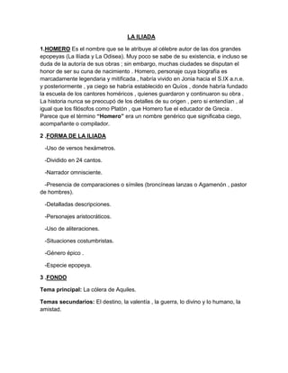 El documento presenta un resumen detallado del primer libro de La Ilíada de Homero. Narra los eventos que llevan a la cólera de Aquiles y su retiro de la batalla, incluyendo cómo Agamenón le arrebata a Briseida. Describe la forma épica de la obra y sus personajes principales, tanto griegos como troyanos. Relata los enfrentamientos entre ambos bandos y las gestas de Diomedes, Héctor, Patroclo y otros hasta la muerte de este último a manos de Héctor, lo que impulsa a Aquiles