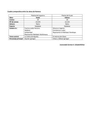La Iliada narra la guerra de Troya entre griegos y troyanos después de que Paris raptara a Helena. Los dioses apoyan a ambos bandos. El conflicto entre Agamenón y Aquiles, y la ira de Aquiles cuando muere su amigo Patroclo son puntos clave. La obra expone valores como el heroísmo, la amistad y la imperfección humana a través de la flexibilidad del estilo de Homero.