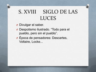 El documento resume la Ilustración en España durante el siglo XVIII. Se usó la literatura para difundir nuevas ideas como el despotismo ilustrado y los pensadores de la época. La prosa didáctica floreció con autores como Feijoo, Jovellanos y Cadalso. El teatro neoclásico rechazó el barroco y volvió a las normas clásicas para presentar conflictos universales y enseñanzas morales.