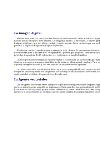 El documento aborda los conceptos fundamentales de la creación y manipulación de imágenes digitales, diferenciando entre imágenes vectoriales y bitmap, y sus respectivas aplicaciones. Se enfatiza la importancia de la resolución, el tamaño del archivo y la profundidad de color al generar imágenes, así como los diversos formatos de compresión. Además, se exploran los modos de color utilizados en la edición de imágenes y su impacto en la representación visual.