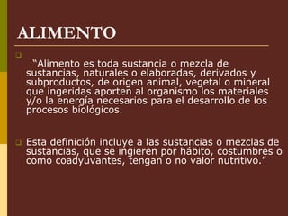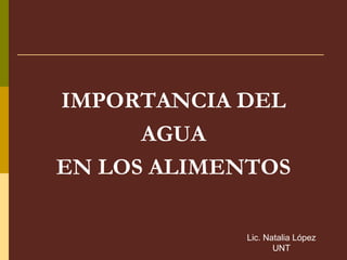 Este documento describe la importancia del agua en los alimentos. Explica que el agua es el constituyente más abundante en los seres vivos y desempeña funciones vitales como medio de reacciones metabólicas, regulación de temperatura, transporte de nutrientes y desechos. También destaca que el agua influye en las características organolépticas de los alimentos y que se encuentra en los alimentos en diferentes estados como líquida, emulsión o parte de la estructura molecular de otros componentes.