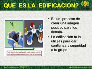 La edificación es un proceso que implica crear una imagen positiva y fomentar la confianza dentro de un grupo, evitando la crítica y centrando la atención en lo positivo. Este proceso comienza en el hogar y se extiende a todos los miembros del equipo, incluidas las líneas ascendentes y descendentes, enfatizando la importancia de reconocer y apoyar a los líderes de otros grupos. La práctica constante de la edificación, que se basa en el respeto y el reconocimiento, es fundamental para el crecimiento y éxito personal y colectivo.