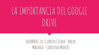 Google Drive es un servicio de almacenamiento en la nube que permite crear y colaborar en documentos, hojas de cálculo y presentaciones en tiempo real. Ofrece 5 GB de almacenamiento gratuito y permite acceder a los archivos desde cualquier lugar. Su uso en el aula permite realizar actividades cooperativas como la producción de textos y el análisis de datos estadísticos.