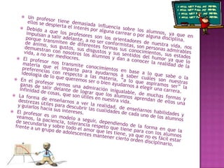 El documento describe la gran influencia que tienen los maestros sobre los estudiantes, guiándolos a descubrir sus intereses y enseñándoles habilidades útiles para la vida. Los maestros transmiten conocimiento de manera admirable y motivan a los estudiantes a no conformarse y salir adelante. El profesor es un modelo a seguir debido a su paciencia, tolerancia y amor hacia los estudiantes.
