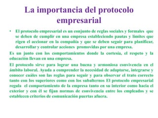 El documento habla sobre la importancia del protocolo empresarial y cómo establece reglas formales y sociales para guiar las interacciones dentro de una empresa. Explica que el protocolo ayuda a lograr una buena convivencia laboral y a definir las normas de comportamiento tanto internas como externas de una compañía. Además, identifica cinco elementos clave en el diseño empresarial: la relación humana, cultural, social e institucional de una empresa y cómo la comunicación interna puede fomentar el sentido de pertenencia de los empleados.