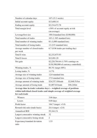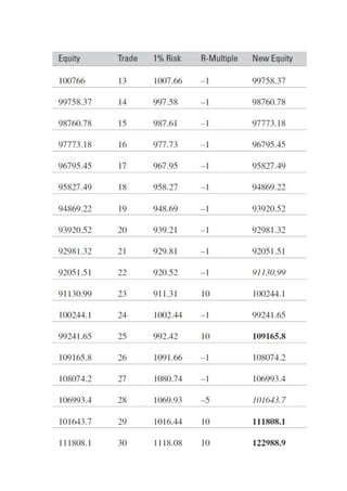 El documento describe la importancia de gestionar adecuadamente el tamaño de las posiciones en la inversión y el trading. Explica que el tamaño de la posición es el factor más importante para alcanzar los objetivos y controlar el riesgo, y que incluso los mejores sistemas pueden fallar si no se gestiona bien este aspecto. También presenta un modelo simple llamado CPR para calcular el tamaño de posición óptimo basado en el capital disponible, el riesgo por unidad y el número de unidades a comprar.