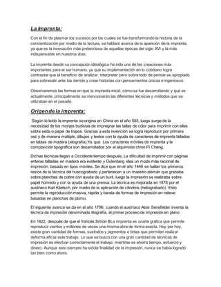 El documento describe la historia y evolución de la imprenta desde su origen en China en el siglo VI hasta la impresión offset moderna. Explica que la imprenta se originó en China cuando los monjes budistas comenzaron a imprimir textos e imágenes en seda y papel para reproducir copias. Más tarde, Johannes Gutenberg desarrolló los tipos móviles de metal en Europa en el siglo XV, revolucionando la impresión de libros. Finalmente, la impresión offset se popularizó en el siglo XX como el método de impresión domin