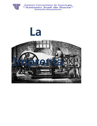 La imprenta es una técnica industrial que permite reproducir textos e imágenes mediante tipos, planchas u otros procedimientos, originándose en Roma y desarrollándose con la invención de tipos móviles en China. Johannes Gutenberg es reconocido como el inventor de la imprenta moderna en 1440, y la imprenta ha evolucionado a lo largo de los siglos con la introducción de diversas tecnologías y métodos. Actualmente, existen diferentes tipos de imprenta, como la digital y la offset, que cumplen funciones esenciales en el diseño gráfico al plasmar imágenes y textos en diversos materiales.