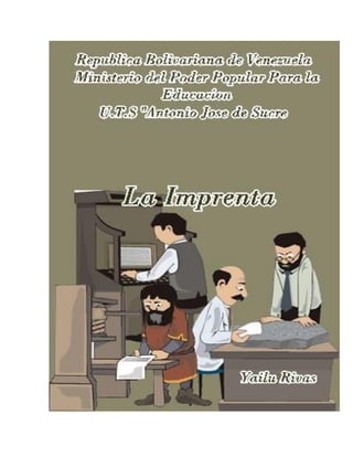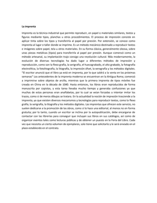 La imprenta es una técnica que permite reproducir textos e imágenes mediante tipos móviles o planchas sobre papel u otros materiales. Se originó en China en el siglo XI y fue perfeccionada por Gutenberg en el siglo XV, revolucionando la cultura con la impresión masiva de libros. A lo largo de los siglos, se han desarrollado nuevas tecnologías como la offset y métodos digitales que han mejorado la impresión.