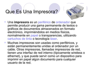 Este documento describe diferentes tipos de impresoras, incluyendo impresoras de chorro de tinta, láser, y plotter. Explica que una impresora produce textos o gráficos almacenados en formato electrónico en papel u otras superficies usando tinta o tecnología láser. También describe los procesos de impresión de chorro de tinta, láser y plotter.