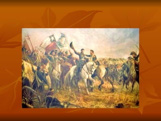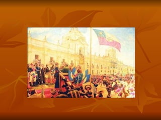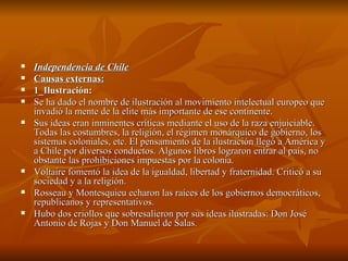 El documento describe las causas internas y externas que llevaron a la independencia de Chile. Entre las causas externas se encuentran las ideas de la Ilustración, la independencia de Estados Unidos, la Revolución Francesa y la invasión de España por Napoleón. Las causas internas incluyen la antipatía creciente entre criollos y españoles y el deseo de los criollos de gobernar de manera autónoma. Finalmente, Chile declaró formalmente su independencia de España mediante el Acta de Independencia firmada por Bernardo O'Higgins