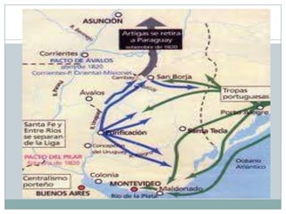 La independencia de Uruguay se logró a través de varias etapas: 1) La Revolución de Mayo en Argentina provocó el grito de Asencio en 1811 en la Banda Oriental, dando inicio al conflicto; 2) Artigas lideró la resistencia contra los portugueses y españoles, logrando una victoria en 1811; 3) En 1816, tropas luso-brasileñas invadieron la provincia; 4) En 1825, los Treinta y Tres Orientales declararon la independencia total de Portugal, y en 1830 se adoptó la primera constit