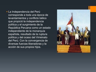El documento describe el proceso de independencia del Perú a través de varios levantamientos y rebeliones entre los siglos XVIII y XIX que llevaron a la creación de la República Peruana independiente de España. Incluye la rebelión de Túpac Amaru II en 1780, las revueltas patrióticas en Tacna en 1811 y 1813, y la llegada del general José de San Martín a Paracas en 1820 luego de independizar Chile.