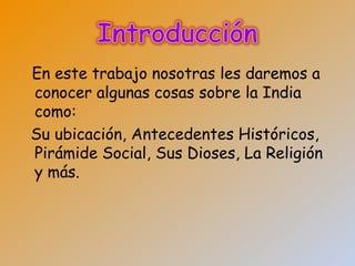 La civilización de la India es una de las más antiguas del mundo. Se originó alrededor del año 1500 a.C. con la llegada de pueblos indoeuropeos que trajeron el idioma sánscrito y sus dioses. La religión hindú surgió alrededor del año 1000 d.C. y reconoce a dioses como Brahma, Vishnu y Shiva. La cultura india ha sido influenciada por sus religiones como el hinduismo y el budismo.