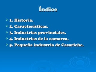 La industria en Andalucía ha tenido históricamente un peso escaso en la economía debido a su debilidad y falta de inversiones. Actualmente se concentra en el sector agroalimentario, automoción, aeronáutica e industria química. Las principales industrias provinciales incluyen el Polo Químico de Huelva, los astilleros de Cádiz, y el Parque Tecnológico de Málaga. La pequeña industria en Casariche comprende empresas de muebles, puertas, cocinas, pat