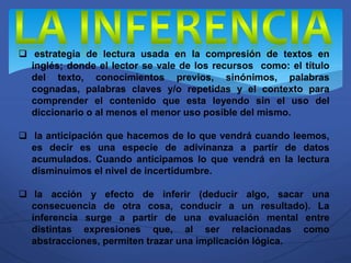 El documento describe tres estrategias para comprender textos en inglés sin usar el diccionario. La primera es anticipar el contenido usando el título, conocimientos previos y palabras clave. La segunda es hacer inferencias sobre lo implícito basadas en evaluaciones mentales. La tercera es deducir significados a través del contexto y la composición/derivación de palabras.