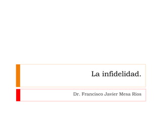 El documento habla sobre la infidelidad en las relaciones de pareja. Define la infidelidad como una relación amorosa o íntima fuera del vínculo de pareja. Explica que la infidelidad no es solo un asunto sexual, sino también emocional. Además, presenta estadísticas sobre la prevalencia de la infidelidad y las motivaciones y etapas más comunes de una aventura amorosa. Finalmente, describe diferentes tipos de amoríos y cómo estos reflejan problemas subyacentes en la relación de pareja.