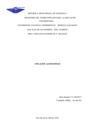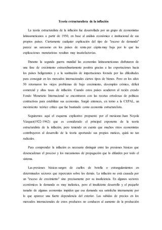 Este documento presenta las teorías estructuralista e inflación y desempleo. Explica que la teoría estructuralista de la inflación fue desarrollada por economistas latinoamericanos en los años 1950 para explicar los problemas de bajo crecimiento, desempleo y alta inflación en la región. Según esta teoría, la inflación se debe a desequilibrios estructurales como estrangulamientos en sectores clave, no a un exceso de demanda. También describe las teorías tradicionales y modernas sobre el desempleo, incl
