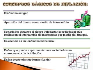 La inflación se define como el aumento generalizado del nivel de precios de bienes y servicios. Puede ser causada por un aumento de la demanda que sobrepasa la oferta, o por un continuo aumento de precios de las materias primas. Existe diferentes tipos de inflación como la coyuntural, de costos, de demanda, tendencial e hiperinflación. Los gobiernos pueden implementar políticas de rentas, controles de precios o cambiarias para combatirla. La inflación tiene efectos negativos como reducir el poder adquisitivo y desalent