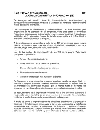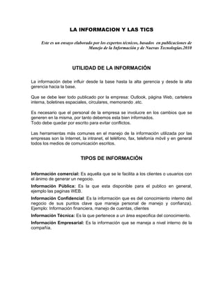 Este documento describe la importancia de la información y las tecnologías de la información y la comunicación (TIC) para las empresas. Explica que la información debe fluir entre todos los niveles de una empresa y que las herramientas TIC como Internet, intranet y teléfonos son cruciales para manejar y distribuir información. También define varios tipos de información y describe cómo las páginas web y otros medios digitales son utilizados por las empresas aunque todavía no se aprovechan completamente para comercio electrónico.