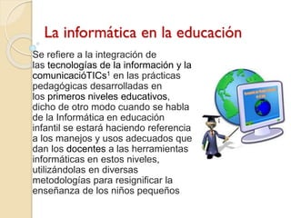 La informática en la educación se refiere a la integración de las tecnologías de la información y la comunicación en las prácticas pedagógicas. La informática educativa investiga, teoriza y aplica los resultados de la informática y la educación en los procesos educativos. El avance de la tecnología también alcanza a la educación, una rama fundamental para la formación del ser humano, y la informática puede utilizarse como apoyo para la enseñanza y estimulación de los niños y jóvenes.