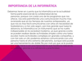 La informática es una parte esencial de la vida cotidiana ya que facilita la comunicación a distancia y actividades tanto simples como complejas. Sin embargo, debe hacerse un buen uso de la tecnología y Internet para evitar problemas. La seguridad informática es importante para proteger los activos digitales como la infraestructura, usuarios e información de amenazas como virus, intrusos y errores.