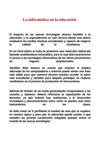El documento discute el impacto de las nuevas tecnologías en la educación y argumenta que las escuelas deben actualizar sus recursos tecnológicos para mejorar la calidad de la enseñanza. También sostiene que se debe reducir el analfabetismo digital y enseñar el uso adecuado de computadoras e Internet para que los estudiantes puedan acceder al conocimiento actualizado y participar en innovaciones. Además, requiere capacitar a los docentes en el uso de estas herramientas en las clases.