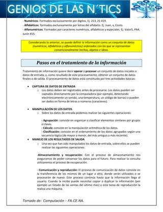 La informática es la ciencia y técnica del tratamiento automático y racional de la información mediante computadoras. Implica conocer las características de las computadoras, los tipos de datos e información, los procesos de captura, manipulación y presentación de datos, y los sistemas de comunicación para compartir la información de forma fiable. El objetivo es procesar datos de entrada para obtener resultados de salida a través de la agrupación, cálculo y clasificación de datos.