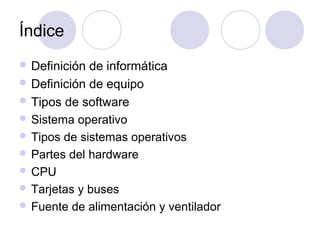 La informática trata sobre los componentes de un ordenador, incluyendo el hardware y software. El hardware se compone de partes como la CPU, tarjetas, buses y periféricos. El software incluye sistemas operativos como Windows, Linux y Android, así como software de aplicaciones y programación. El documento también explica conceptos clave como informática, equipo, tipos de software y partes del hardware de un ordenador.