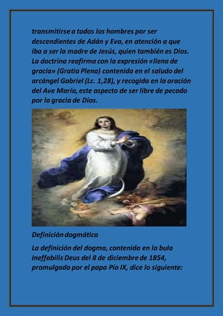 Este documento resume la doctrina católica de la Inmaculada Concepción, la cual sostiene que la Virgen María estuvo libre del pecado original desde el momento de su concepción. El dogma fue decretado en 1854 e indica que María fue preservada por los méritos de Cristo. Además, explica que esta doctrina no debe confundirse con la virginidad de María ni es aceptada por algunas iglesias protestantes aunque Lutero creía en la pureza original de María.