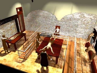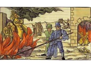 La Inquisición fue una institución judicial creada por la Iglesia Católica en la Edad Media para localizar, procesar y condenar herejes mediante métodos de tortura. Existieron varios tipos de Inquisición, como la española, la medieval, la romana y la portuguesa, establecidas en diferentes épocas y lugares para perseguir herejías y mantener el control religioso.