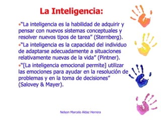 El documento aborda diversas definiciones y enfoques sobre la inteligencia, destacando concepciones de autores como Sternberg, Pintner y Gardner. Se presentan enfoques biológicos, psicométricos y triárquicos, así como la inteligencia emocional y exitosa, enfatizando la adaptación a situaciones cotidianas. Se concluye con la necesidad de un modelo de inteligencia que considere aspectos diferenciales, funcionales y situacionales en el comportamiento humano.