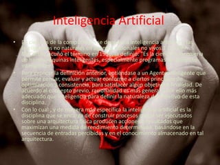 El documento define la inteligencia artificial como la ciencia e ingeniería de hacer máquinas inteligentes, especialmente programas de cómputo inteligentes. Explica que la IA se encarga de construir procesos que producen acciones o resultados que maximizan una medida de rendimiento basándose en entradas percibidas y conocimiento almacenado. También categoriza los sistemas de IA en aquellos que piensan como humanos, actúan como humanos, piensan racionalmente y actúan racionalmente. Finalmente, discute la posibilidad de incorporar component