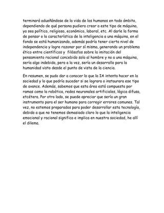 Este documento discute la inteligencia artificial (IA) y plantea preguntas sobre si las máquinas pueden imitar o incluso superar la inteligencia humana. Explica que la IA involucra temas como la robótica, las redes neuronales y la lógica difusa. También señala que aunque la IA puede usarse para beneficiar a la humanidad, también plantea problemas éticos si las máquinas llegan a igualar o superar la inteligencia humana.