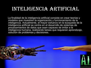 El documento describe la inteligencia artificial y los robots. Explica que la inteligencia artificial intenta crear modelos que muestren cómo funciona la inteligencia humana. Luego describe a ASIMO, un robot humanoide avanzado desarrollado por Honda para ser útil para las personas. ASIMO puede caminar y reconocer caras, y Honda espera que pueda ayudar a las personas discapacitadas.