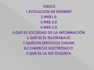 Este documento resume la evolución de Internet desde la Web 1.0 hasta la Web 3.0, describiendo cada etapa y sus características principales. También define conceptos clave como sociedad de la información, teletrabajo, servicios en línea, comercio electrónico y netiqueta.