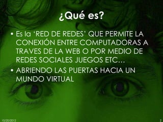 El documento describe la Internet como una red de redes que conecta computadoras a través del mundo. Ofrece ventajas como comunicación sencilla y acceso a información, pero también riesgos como contenido inapropiado, adicción y dependencia excesiva, así como exposición a personas peligrosas a través de chats.