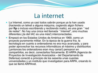 La Internet comenzó como un proyecto militar en 1969 en Estados Unidos para compartir recursos informáticos entre universidades e instituciones de investigación. Se creó la ARPAnet para conectar estas organizaciones. Más adelante, la Internet se expandió para conectar muchas redes diferentes de todo el mundo, permitiendo la comunicación y el intercambio de información entre personas de todas partes. Tiene tanto ventajas como encontrar información y personas fácilmente, como desventajas como acceder a contenidos inadecuados o volverse dependiente de la conexión.