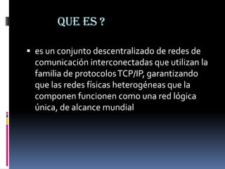 Internet es una red descentralizada de redes interconectadas que utilizan protocolos TCP/IP para funcionar como una red lógica global. Se originó en la década de 1960 para compartir recursos entre investigadores, y creció exponencialmente en los años 90 con la introducción de herramientas gráficas y servicios como el correo electrónico y la World Wide Web. Actualmente, miles de millones de personas usan Internet diariamente para comunicarse, buscar información, entretenimiento y trabajo remoto.