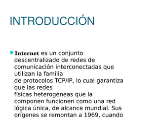 El documento habla sobre el Internet. Explica que Internet es una red descentralizada de redes interconectadas que usan los protocolos TCP/IP para funcionar como una red lógica global. También describe algunas de las cosas comunes que se pueden hacer en Internet como navegar la web, usar correo electrónico, buscar información, usar redes sociales y comprar y vender productos. Además, menciona algunos navegadores y buscadores populares como Internet Explorer, Mozilla Firefox, Facebook y Google.