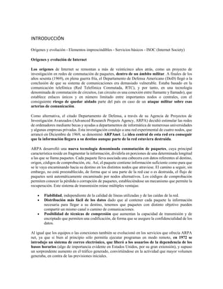 El documento describe los orígenes e historia de Internet. Comenzó como un proyecto militar estadounidense en la década de 1960 llamado ARPAnet que usaba la tecnología de conmutación de paquetes para hacer la red más resistente. En la década de 1970 se desarrollaron protocolos como TCP/IP y servicios como correo electrónico que permitieron la conexión de más redes. En la actualidad, Internet es una red global que conecta millones de redes y usuarios alrededor del mundo.