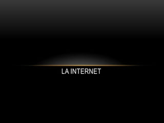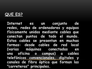 Internet es una red global de redes interconectadas que permite la comunicación entre computadoras de todo el mundo a través de cables, protocolos como TCP/IP y servicios como correo electrónico y la World Wide Web. Surge en la década de 1960 para fines académicos y militares y experimenta un rápido crecimiento en los años 1980 y 1990 con la expansión del correo electrónico, las redes privadas y el desarrollo de la Web, transformándose en una herramienta global de comunicación e información.