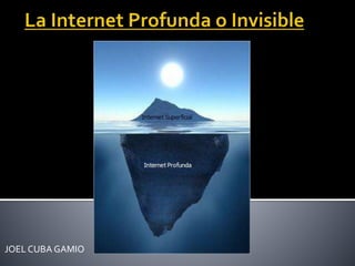 El documento describe la "Internet invisible", que es información en Internet solo accesible a través de páginas dinámicas luego de realizar consultas en bases de datos, y no a través de procesos habituales de recuperación de información. También habla de la "Internet oscura", que son servidores o sitios totalmente inaccesibles desde un ordenador, generalmente por razones de seguridad nacional o militar. Finalmente, explica que herramientas como TOR permiten acceder a esta información invisible y proteger la privacidad de los usuarios.